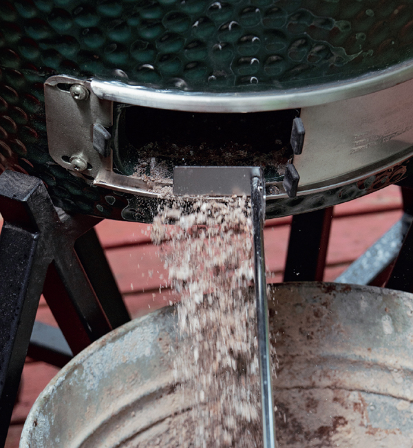 When you are ready to do your next cook, remove the cooking grid and convEGGtor and set them aside. Stir the remaining coals with your ash tool, allowing the spent ash to drop to the bottom of the EGG. Insert the ash tool into the bottom vent door and scrape out the ash into a small metal ash can fitted with a lid. Reload your firebox with fresh charcoal and stir to combine it before lighting.